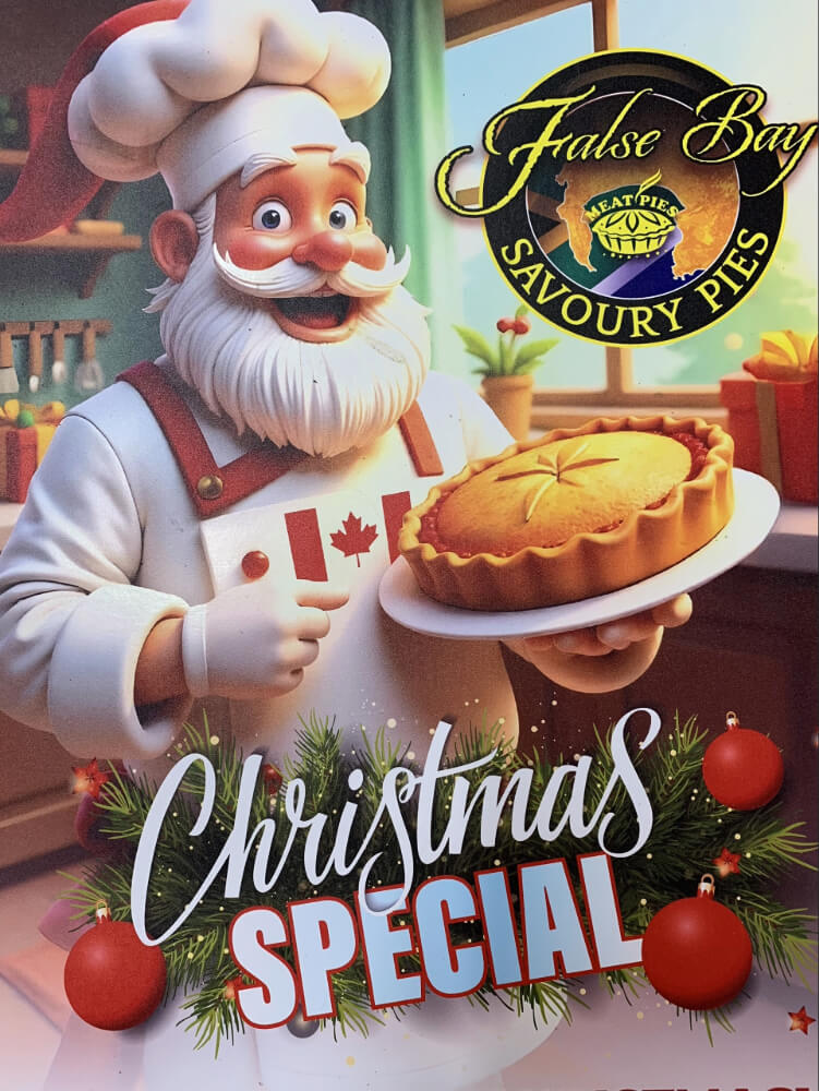 Flavours include Tourtiere, Turkey, stuffing and cranberries, or Chicken pie. Call 604-230-8109 to order on or before December 21st!